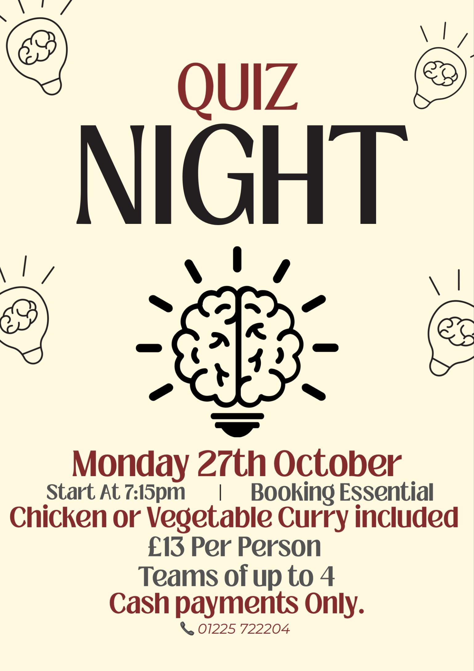 Join us for our ever popular pub quiz with an accompanying curry with all the trimmings. Just £13 per person including dinner. Teams of 4 Booking essential.