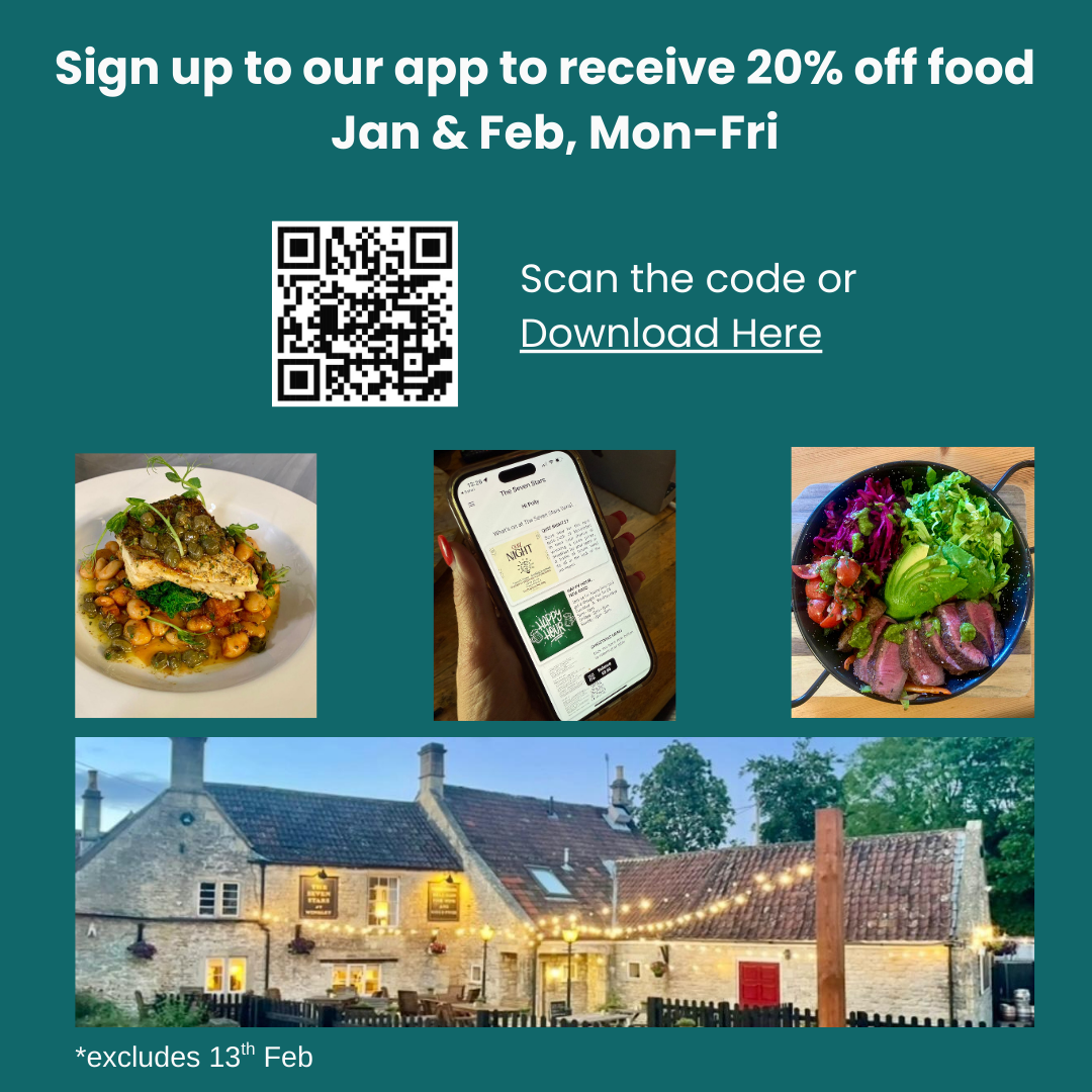 Sign up to our app to receive 20% off food Mon-Fri throughout Jan & Feb. Excludes 13th Feb.