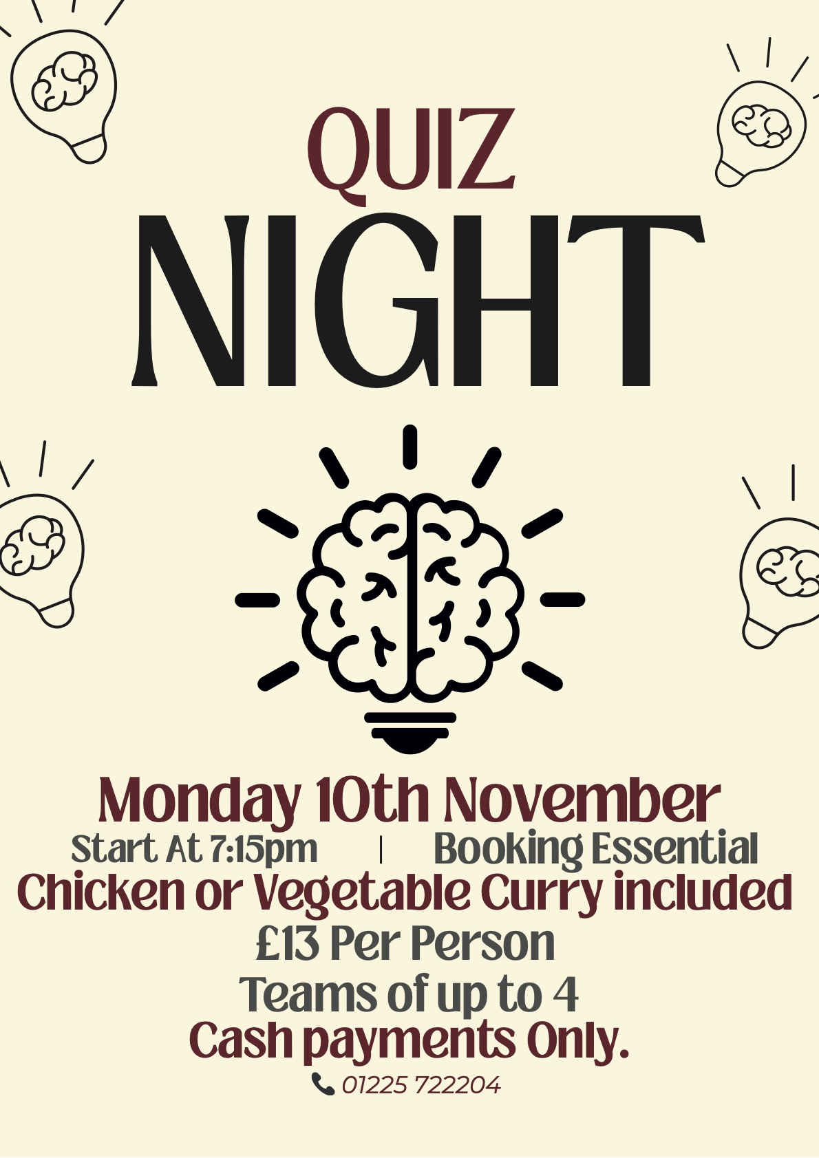 ***£500 PRIZE - ROLLOVER!!*** Join us for our ever popular pub quiz with an accompanying curry with all the trimmings. Just £13 per person including dinner. Teams of 4 Booking essential.