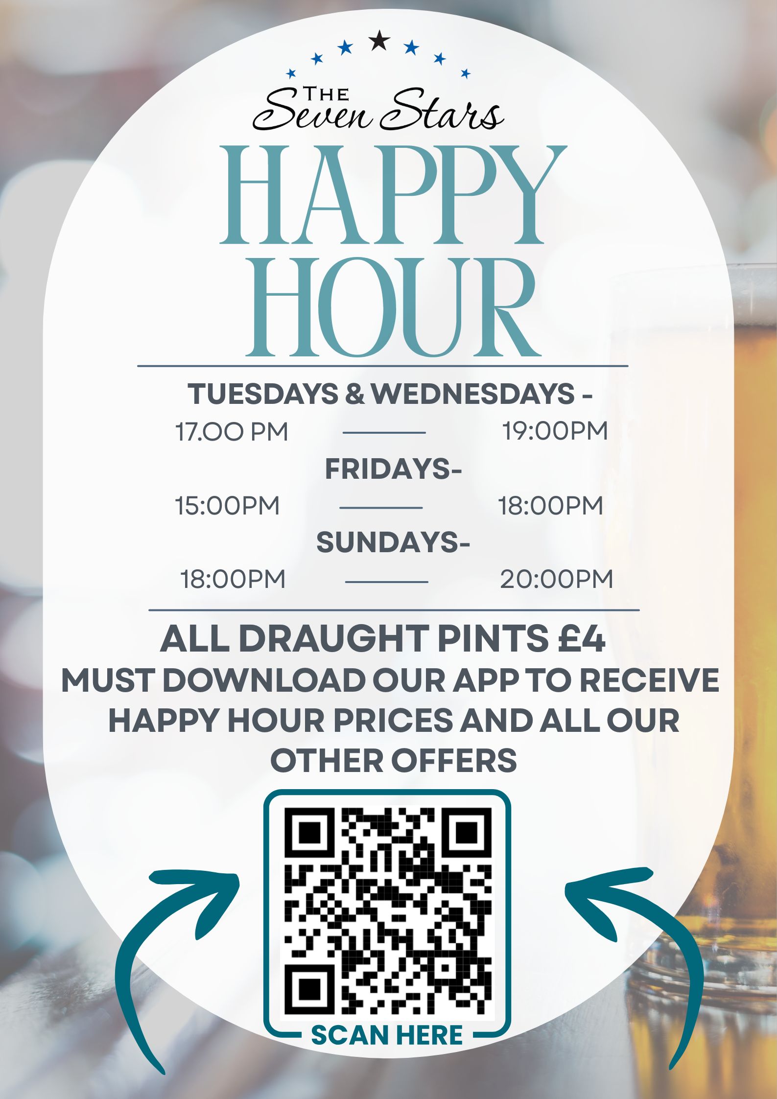 Tuesdays & Wednesdays 5pm - 7pm Fridays 3pm - 6pm Sundays 6pm - 8pm Download our app to be the first to see all our events and take advantage of our special offers!